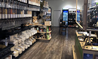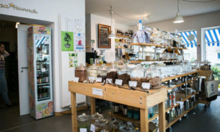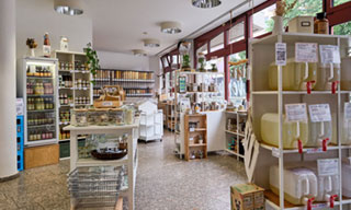 Kölns 1. Bio Unverpackt Laden | „Die Auswahl ist groß und verführerisch. Es gibt etliche Reinigungsmittel, sowohl für die persönliche Hygiene als auch für den Hausputz, und viele haltbare Gebrauchsgegenstände für Haushalt und Schule, Getreide-Produkte von Mehlen bis Müsli in großer Auswahl (es wird auch vor Ort gemahlen), Nudeln, Reis, getrocknetes Obst, Gewürze, Getränke …“